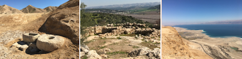 Figures: (1) Bedouin watering hold deep in the Judean desert. (2) Extraordinary and recently excavated ruins of Khirbet Quiyafa in the Elah valley, where David most likely really did vanquish Goliath. (3) Jordan, seen from the desert cliffs high above the Dead Sea.