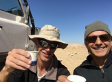 Atar Zehavi (off-road aficionado and Israeliwild tour operator) with Henri Colt (physician-writer and climber) sharing coffee in the shade of their Land Rover deep in the Judean desert.